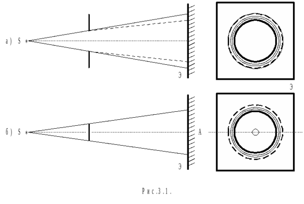Если на пути света, испускаемого источником S, поставить непрозрачный экран с малым отверстием, то световые волны отклоняются от прямолинейного пути распространения. Свет, огибая края отверстия, распространяется в область геометрической тени, и на экране Э (рис. 3.1а) получится более широкое светлое пятно, чем это следует из геометрических построений.