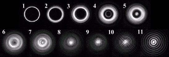 На рис. 3.18 представлено распределение интенсивности света на экране, расположенном за отверстием в виде тонкого кольца, по мере увеличения расстояния между отверстием и экраном. Можно проследить плавный переход от геометрической оптики (1-3) через дифракцию Френеля (4-7) к дифракции Фраунгофера (9-11). Число открытых зон уменьшается слева направо.3.8. Дифракционная решетка