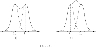 Рэлей ввел критерий, согласно которому две линии в спектре можно считать разрешенными (т.е. наблюдаемыми отдельно). Две линии с длинами волн 1 и 2 принято считать разрешенными в k-м порядке, если k-й дифракционный максимум для длины волны 1 совпадает с минимумом, ближайшим к k-му максимуму, для длины волны 2 . При этом суммарная интенсивность в провале между двумя линиями дифракционного спектра равна 0,7 от интенсивности максимумов. Считается, что такое различие в интенсивностях может быть легко зарегистрировано глазом (рис.3.21а). Если же спектральные линии расположены ближе, то в промежутке между линиями будет находиться провал меньшей глубины (неразличимый глазом) или вообще "горб" интенсивности (рис.3.21б).
