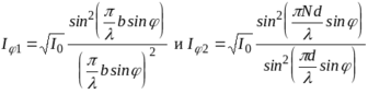 где I0 - это интенсивность света, вышедшего из одной щели под углом . Но эта величина была найдена в п.3.6 (формула (3.33)), следовательно,