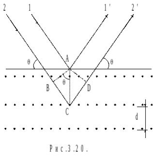 Пусть падающий пучок рентгеновских лучей образует угол с одной из систем таких плоскостей. Кристаллическую структуру, изображенную на рис.3.22, можно рассматривать как объемную дифракционную решетку с периодом d, равным расстоянию между соседними слоями атомов. Разность хода лучей, рассеянных первым и вторым слоем атомов, для случая, когда направление падающих и рассеянных лучей составляет с атомными плоскостями один и тот же угол , равна BC+CD. Подсчет этой величины дает для разности хода лучей 1 и 2 выражение