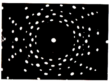 Если направить на кристалл пучок рентгеновских лучей, обладающих набором различных длин волн, то лишь те из них, которые удовлетворяют условию (3.46), дадут интерференционную картину, т.е. существенные пики интенсивности рентгеновского излучения. Таким образом, можно выделить из широкого спектра пучок лучей, соответствующих узкому диапазону длин волн.Типичная дифракционная картина рентгеновских лучей на кристалле представлена на рис. 23.