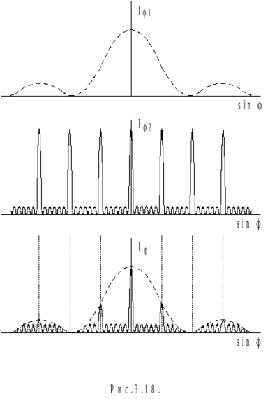 Графики функций I1 и I2 в зависимости от sin представлены на рис.3.18 а. и б., а их произведения - на рис.3.18в. Мы видим, что при освещении дифракционной решетки монохроматическим светом, распределение интенсивности света на экране за ней представляет из себя ряд максимумов (называемых главными), разделенных практически темными участками. Угловое положение главных максимумов определяется из условия