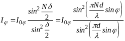 Угловая ширина главного максимума определяется как угловое расстояние между направлениями на минимумы, ближайшие к данному максимуму. Взяв дифференциал от выражения (3.37), легко получить, чтоОтсюда видно, что ширина главных максимумов уменьшается с ростом числа щелей N.