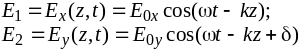 Рассмотрим суперпозицию двух линейно поляризованных волн одной и той же частоты, распространяющихся в одном и том же направлении, плоскости колебаний вектора Е которых взаимно перпендикулярны (рис. 4.3.)
