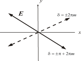 Линейно (плоско) поляризованной называется волна, вектор E которой в процессе распространения колеблется в одной плоскости, проходящей через луч (рис.4.1а). Линейно поляризованную волну принято на рисунках изображать при помощи условных обозначений, смысл которых понятен из рис.4.2. Линейно поляризованная волна, представленная на рис. 4.2а, имеет вектор Е, лежащий в плоскости листа. Вектор Е волны, изображенной на рис.4.2б, перпендикулярен плоскости листа.