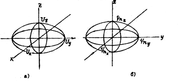 Аналогичный вид имеет поверхность, иллюстрирующая зависимость от направления величины, обратной показателю преломления (т.е. 1/n), (рис.4.8б). Значения показателя преломления в направлениях, совпадающих с осями эллипсоида, называются главными значениями показателя преломления.
