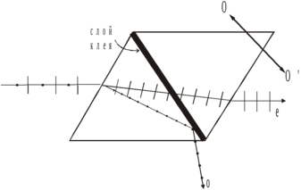 В призме Николя (рис.4.11.) две составляющие ее призмы с оптической осью, направленной по ОО’, склеены клеем с показателем преломления nk, для которого выполнено соотношение ne< nk< no. При выполнении этого условия обыкновенный луч испытывает полное внутреннее отражение на границе раздела призма-клей и выводится из призмы.