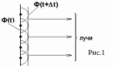 усть Ф(t) – фронт волны в момент времени t (см. рис. 1). Тогда, согласно принципу Гюйгенса, фронт волны в момент времени t+t совпадает с поверхностью огибающей всех вторичных волн. Основная слабость принципа Гюйгенса в том, что он не учитывает явления интерференции вторичных волн и, следовательно, не позволяет рассчитывать амплитуды волн, распространяющихся в различных направлениях.