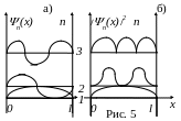 Графики этих функций, соответствующие уровням энергии при n=1, 2, 3, приведены на рис. 5 (а). На рис. 5 (б) изображены плотности вероятности обнаружения частицы на различных расстояниях от «стенок» ямы