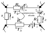 П ри этом также следует придерживаться правила знаков: токи, текущие вдоль выбранного направления обхода контура считаются положительными, а идущие против направления обхода - отрицательными. Соответственно положительными считаются ЭДС тех источников, которые вызывают ток, совпадающий по направлению с обходом контура (см. рис.7), где обозначает направление обхода контура .
