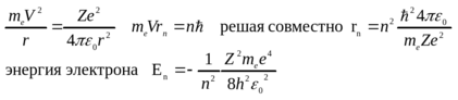 1 постулат Бора : в атоме существуют стационарные состояния в которых он не излучает энергии. В стационарном состоянии электрон , двигаясь по круговой орбите, должен иметь дискретные квантованные значения момента импульса удовлетворяющие условию
