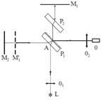 Параллельный пучок света от источника L падает на полупрозрачную пластину P1, разделяется на два когерентных пучка 1 и 2. После отражения от зеркал M1 и M2 и повторного прохождения луча 2 через пластину P1 оба луча проходят в направлении АО через объектив О2 и интерферируют в его фокальной плоскости. Пластина P2 компенсирует разность хода
