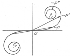 есконечно длинную щель можно образовать, расположив ряжом две обращенные в разные стороны полуплоскости. Следовательно, задача и дифракции Френеля от щели может быть решена с помощью спирали Карню. Волновую поверхность падающего света, плоскость щели и экран, на котором наблюдается дифракционная картина, будем считать параллельными друг другу. Для точки Р, лежащей против середины щели, начало и конец результирующего вектора находятся в симметричных относительно начала координат точках спирали. Если сместиться в точку Р’, лежащую против края щели, начало результирующего вектора переместится в середину спирали О. Конец вектора переместится по спирали в направлении полюса F1.