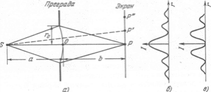 , значительно меньшем, чем указанные на рис. длины a и b, длину a можно считать равной расстоянию от источника S, до преграды, а длину b – от расстояния преграды до Р. Если расстояния а и b удовлетворяют соотношению: