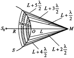 Из теории Френеля (световая волна, возбуждаемая каким-либо источником S, может быть представлена как результат суперпозиции когерентных вторичных волн, «излучаемых» фиктивными источниками, такими источниками могут служить бесконечно малые элементы любой замкнутой поверхности, охватывающей источник S). следует, что в том случае, когда в отверстии укладывается только одна зона Френеля, амплитуда колебаний в точке М