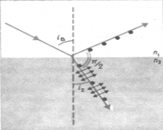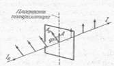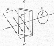 сли угол падения на границу раздела двух диэлектриков (например, на поверхность стеклянной пластинки) отличен от нуля, отраженный и преломленные лучи оказываются частично поляризованными (при отражении от проводящей поверхности (например, от поверхности металла) получается эллиптический поляризованный свет). В отраженном луче преобладают колебания, перпендикулярные к плоскости падения (на рис. эти колебания обозначены точками), в преломленном луче – колебания, параллельные плоскости падения (на рисунке они изображены двусторонними стрелками). Степень поляризации зависимость от угла падения. Обозначим через