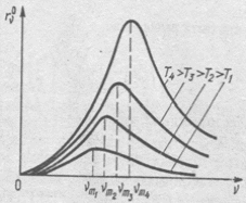 – постоянная величина. Сущ-вание на каждой кривой более или менее ярко выраженного максимума свидетельствует о том, что энергия излучения ЧТ распределена по спектру неравномерно: черное тело почти не излучает энергии в области очень малых и очень больших частот. По мере повышения температуры тела максимум