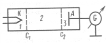 ) и анод (А). Электроны, эмитируемые катодом, ускорялись разностью потенциалов, приложенной между катодом и сеткой