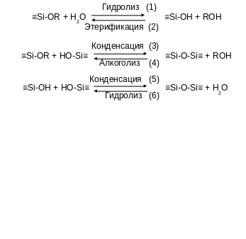 Гидролиз алкоксида кремния ведёт к образованию силанолов (1), которые могут конденсироваться двумя способами (реакции (3) и (5)), причём при проведении золь-гель процесса в кислой среде реализуется механизм образования трёхмерной сетки кремниевого геля. По мере протекания золь-гель процесса возрастает влияние обратных реакций – этерификации силанолов (2) и разрыва силоксановых связей за счёт реакций алкоголиза (4) и гидролиза (6), приводящих к деструкции матрицы геля.