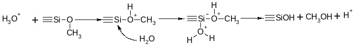 В этом случае электронные связи Si-O смещаются в сторону атома кислорода, что приводит к увеличению положительного заряда на атоме кремния. В этом случае, молекула воды может атаковать атом кремния; образуется промежуточный комплекс, который распадается с выделением спирта.