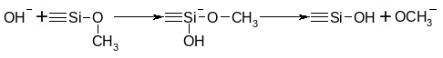Ион OH‾ имеет высокий нуклеофильный заряд и способен атаковать атом кремния алкоксисоединения непосредственно, поскольку атом кремния обладает высоким положительным зарядом. При этом атом кремния в переходном комплексе приобретает отрицательный заряд.