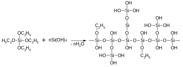 По мере уменьшения этоксигрупп вероятность эффективного столкновения с ними молекул воды уменьшается. В конечном счете, происходит образование разветвленного высокомолекулярного пространственно-сшитого полисилоксана, имеющего как гидроксильные группы, так и некоторое количество этоксигрупп. Этот полимерный гель прочно адсорбирует воду и спирт.