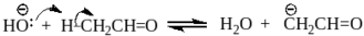 Альдольное присоединение проходит по трехстадийному механизму. На первой стадии основание (гидроксид-анион) отрывает протон от углерода молекулы ацетальдегида давая енолят-ион с делокализованным отрицательным зарядом: