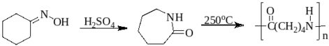 При обработке оксима циклогексанона серной кислотой происходит перегруппировка Бекмана с образованием капролактама, полимеризующегося при нагревании в капрон: