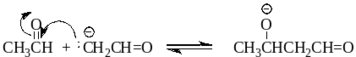 При действии на ацетальдегид разбавленного раствора NaOH при обычной или даже пониженной температуре происходит его димеризация с образованием 3-гидроксибутаналя. Поскольку 3-гидроксибутаналь одновременно является альдегидом и спиртом (алкоголь) его обычно называют “альдоль”, а реакции такого типа стали называть реакциями альдольного присоединения.