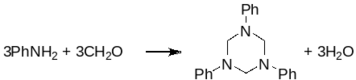 Анилин реагирует с формальдегидом с образованием 1,3,5-трифенил-1,3,5-триазациклогексана: