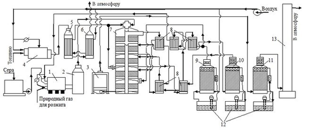 1 – печь для сжигания серы; 2 – котел-утилизатор; 3 – экономайзер; 4 – пусковая топка; 5,6 – теплообменники пусковой топки; 7 – контактный аппарат; 8 – теплообменники; 9 – сушильная башня; 10, 11 – первый и второй моногидратные абсорберы; 12 – сборники кислоты; 13 – выхлопная труба.