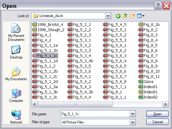 Open (Открыть). Открывает файл. Содержит средства выбора места расположения файла, панель со списком файлов для выбора, поле отображения выбранного имени файла, поле выбора типа файла со вложенным списком, кнопки Open (Открыть), Cancel (Отменить).