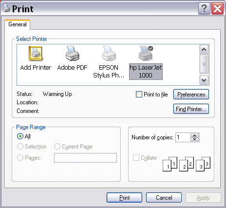 Print (Печать). Осуществляет печать файл. Содержит средства выбора принтера, панель конфигурационных установок, поле задания числа копий, панель выбора печатаемых страниц, кнопки Print (Печать), Cancel (Отменить).