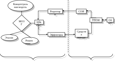 Переменные компоненты – являются результатом анализа потока информации об ОУ (объекте управления), передаваемого ДИМ. Выявленные изменения приводят к модификации концептуальной модели, оцениваются и активизируют соответствующие способы реагирования. Образно-концептуальная модель имеет сложный характер, может содержать зрительные, слуховые, тактильные, обонятельные, вестибулярные и другие состовляющие.