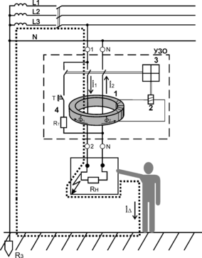 При прикосновении человека к открытым токопроводящим частям или к корпусу электроприемника, на который произошел пробой изоляции, по фазному проводнику через УЗО кроме тока нагрузки I1 протекает дополнительный ток − ток утечки (IΔ), являющийся для трансформатора тока дифференциальным (разностным).