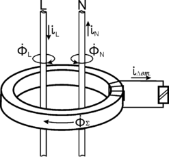 Суммарный магнитный поток в сердечнике − ФΣ, пропорциональный разности токов в проводниках, являющихся первичными обмотками трансформатора, iN и iL, наводит во вторичной обмотке трансформатора тока соответствующую эдс, под действием которой в цепи вторичной обмотки протекает ток iΔвт, также пропорциональный разности первичных токов.