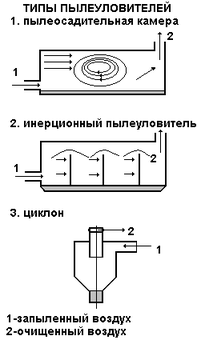Очистка воздуха при использовании пылеуловителя осуществляется за счет действия сил тяжести и сил инерции.