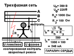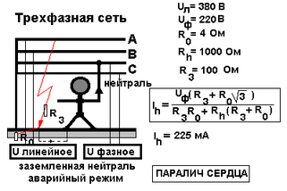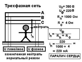 В трехфазных четырехпроводных сетях с заземленной нейтралью подключение электроустановок с заземленными корпусами недопустимо, так как в этом случае нарушение изоляции любой из фаз электроустановки с заземленным корпусом приводит к резкому ухудшению условий электробезопасности всех электроприемников, питающихся от данной сети.