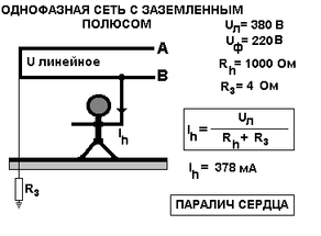 При замыкании фазы А на корпус машины (электродвигателя) сила тока, протекающего через тело человека запишется в следующем виде: