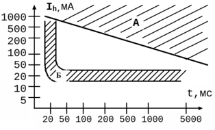 Рис.30. График токовременной зависимости физиологического действия на человека переменного тока (50-60 Гц) и рабочей характеристики УЗО: А -область токов, вызывающих опасность фибрилляции сердца (вероятность < 50%) по МЭК 479; Б -зона срабатывания УЗО,