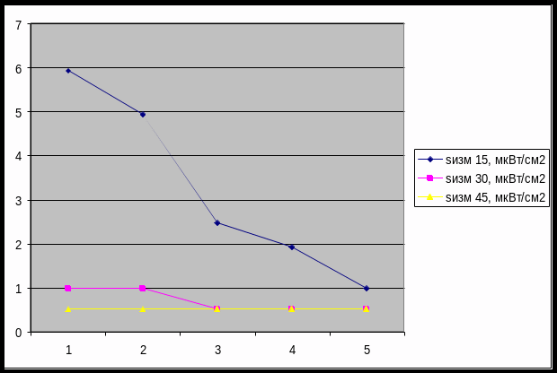 | изм, мкВт/см2 | 12,34 | 8,88 | 5,43 | 2,46 | 1,23 | 1,23 | 1,23 | 0,98 |