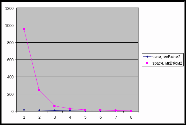 | расч, мкВт/см2 | 955 | 239 | 60 | 27 | 15 | 10 | 7 | 5 |