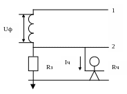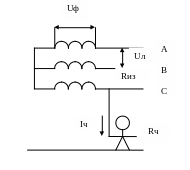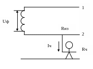 Uф – фазное напряжение; Rиз –сопротивление изолированного провода; Rч – сопротивление тела человека
