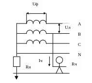 Uф – фазное напряжение; Uл – линейное напряжение; Rн – активное сопротивление заземления нейтрали; Rч – сопротивление тела человека
