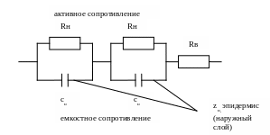 Сопротивление наружного слоя кожи состоит из активного сопротивления Rн и емкостного Сн.