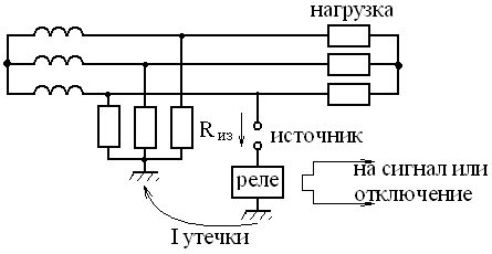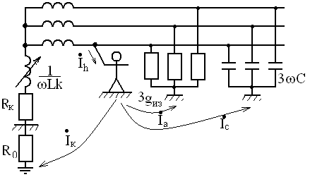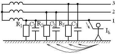 | Цепь тока замыкается через тело человека, землю и далее через сопротивления изоляции и емкости фаз. |