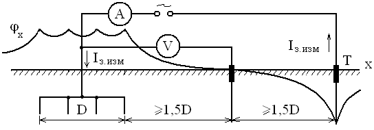 Контроль зз. производят не реже 2 раз в год. Сопротивление зз. измеряют по схеме: