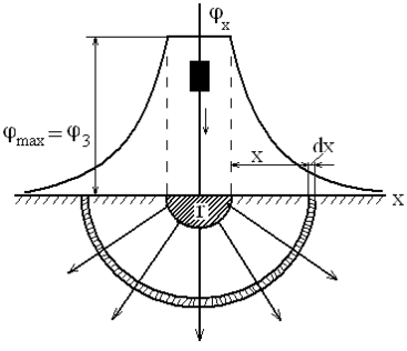 Рассмотрим методику определения распределения потенциала в зоне растекания тока с заземленного корпуса и сопротивления заземлителя на примере полусферического заземлителя (считаем грунт однородным, а значит растекание тока замыкания равномерным по радиальным направлениям).