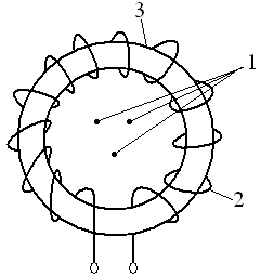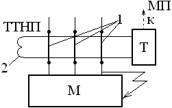 Схема а.з.о. (входной сигнал – ток нулевой последовательности). В этой схеме датчиком является трансформатор тока нулевой последовательности ТТНЛ. Первичная обмотка ТТНЛ – три фазных провода (1), вторичная обмотка (2) намотана на кольцевом магнитопроводе (3).